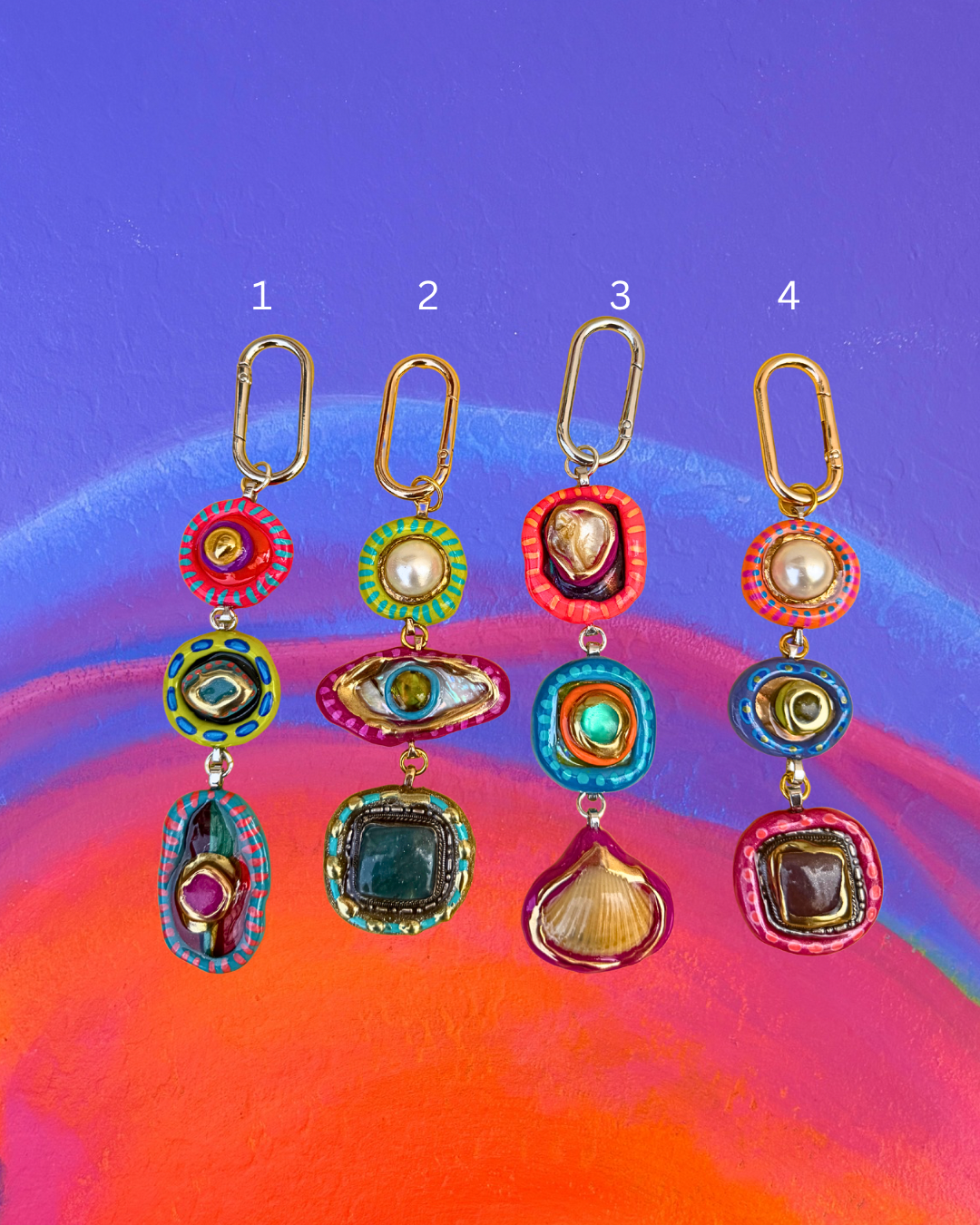 Made from vintage, up-cycled jewelry pieces, shells, pearls, hand sculpted clay, hand painted, and coated in a durable resin coating. Each bag charm comes in a gold or silver stainless steel carabiner clasp.